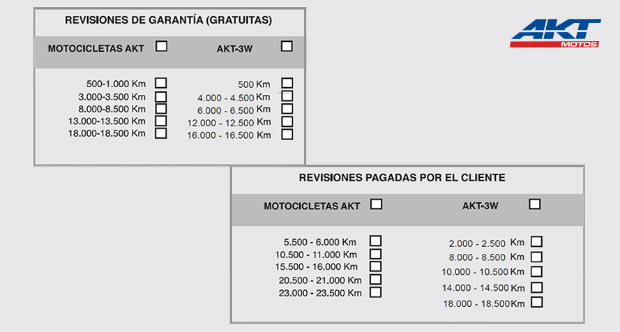 Motocicletas AKT: 24 meses o 24.000 km, lo primero que se cumpla y 5 revisiones gratuitas, las 5 revisiones adicionales obligatorias deben ser canceladas por el cliente
